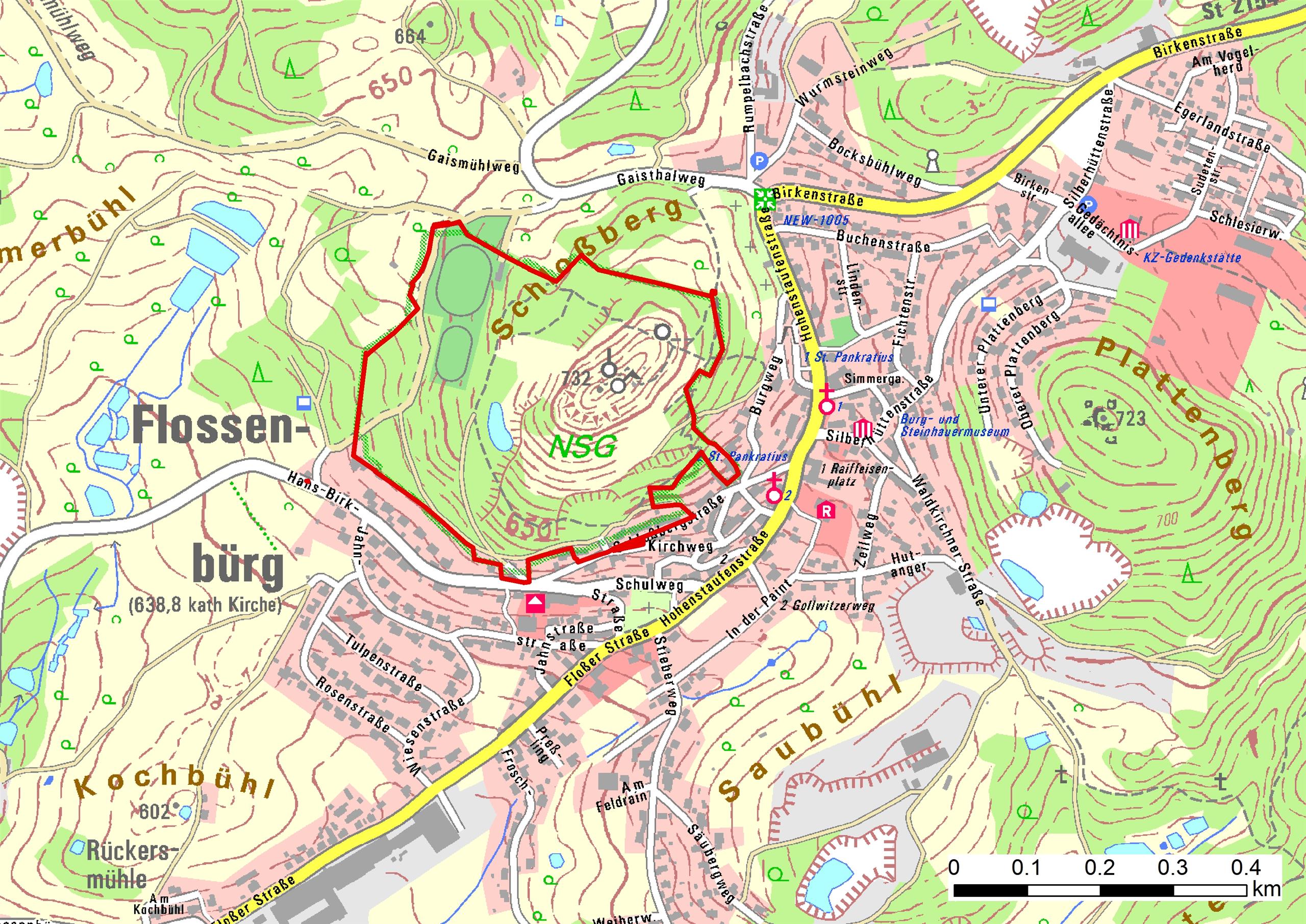 732 metrů vysoký kopulovitý kopec ze žuly s překrásně položenou zříceninou hradu představuje v přírodní oblasti Hornofalckého lesa geologickou zvláštnost. Vrstvení v podobě cibulové slupky se táhne kolem celého kopce a na některých místech je dobře patrné. Tyto vrstvy vznikly v důsledku změny tlaku a napětí při výzdvihu a odnosu horniny. V přírodní rezervaci Schlossberg Flossenbürg došlo k plošnému odlupování, a vytvořila se tak kopule. V minulosti měl Schlossberg velký význam pro těžbu žuly, díky čemuž Schlossberg získal svůj jedinečný tvar a došlo k jeho odkrytí. Zdaleka viditelná zřícenina hradu, jejíž historie sahá do počátku 12. století, je symbolem přírodního parku Hornofalcký les. Díky opatřením péče o krajinu v přírodním parku zde zůstávají viditelné výchozy, které umožňují nahlédnout do vnitřní struktury hory. Díky své zvláštní geologické situaci poskytuje tato oblast útočiště vzácným druhům živočichů a rostlin.